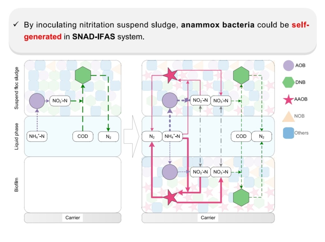 近日,水污染控制课题组2017级硕士研究生都叶奇在一体化固定生物膜活性污泥反应器中实现快速培养自生厌氧氨氧化细菌方面取得重大进展。相关成果以“Achieving simultaneous nitritation, anammox and denitrification (SNAD) in an integrated fixed-biofilm activated sludge (IFAS) reactor:Quickly culturing self-generated anammox bacteria”为题发表在国际期刊Science of The Total Environment(SCI二区,IF=6.551)上。爱情岛论坛