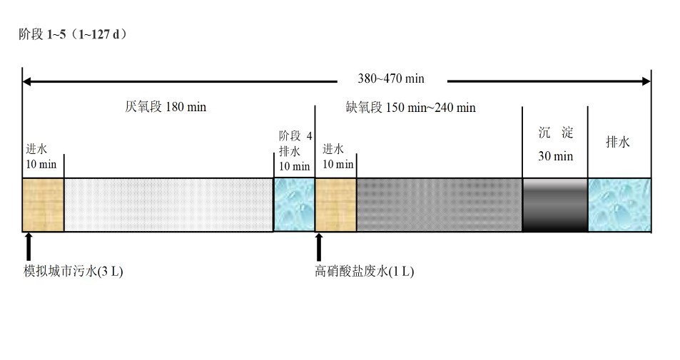 目前,有关PD工艺与DPR工艺耦合用于同时处理城市污水和含硝酸盐废水, 并实现稳定亚硝积累和高效磷去除的研究还鲜见报道。在该PD-DPR耦合工艺中,外源和内源短程反硝化及反硝化除磷过程在NO3--N去除、NO2--N积累和PO43--P去除中的贡献,以及工艺的优化运行特性还有待研究。并且,该耦合工艺与 ANAMMOX组合用于处理城市污水和含硝酸盐废水的可行性也需进一步探索。本研究采用厌氧-缺氧-微曝气运行的序批式活性污泥反应器(SBR),以模拟城市污水和高硝酸盐废水为处理对象,通过联合调控进水C/N比、厌氧排水比和缺氧时间,考察了PD-DPR耦合系统的启动和优化运行特性,并探索了PD-DPR过程NO2--N积累和PO43--P去除机制,以期为PD-DPR耦合ANAMMOX 实现城市污水和高硝酸盐废水的深度脱氮除磷提供实验数据和理论支持。