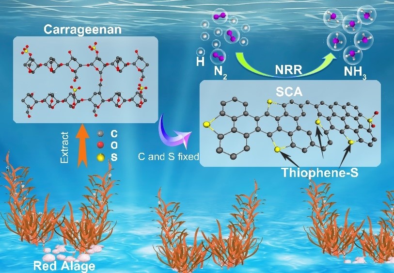海水的富营养化导致海洋藻类的大量入侵,而藻类(如红藻)包含了大部分的海洋生源S,经过氧化分解等过程释放到大气中形成酸雨,给生态系统带来严重的危害。在红藻中,大多数生物源S都存在于富含磺酸基团的卡拉胶中。本项工作利用卡拉胶独特的结构特性,通过热解将其中89%的C和96%的生物源S原位固化到生物炭中,得到了噻吩S修饰的生物炭气凝胶(SCA),并应用到电催化固氮领域。实验上,所得SCA的NH3产率高达36.69 μg h−1 mg−1cat,优于大多数非金属电催化剂;理论计算表明,SCA中的噻吩S结构能有效促进N2的吸附和活化,进而降低N2质子化的能量势垒。这项工作实现了海藻固废的材料化,有效地起到固C和减C的作用,助力国家“双碳”战略目标;同时,也将海藻固废资源化,将其应用到新型电催化领域,拓展了海藻固废的高值化利用途径。