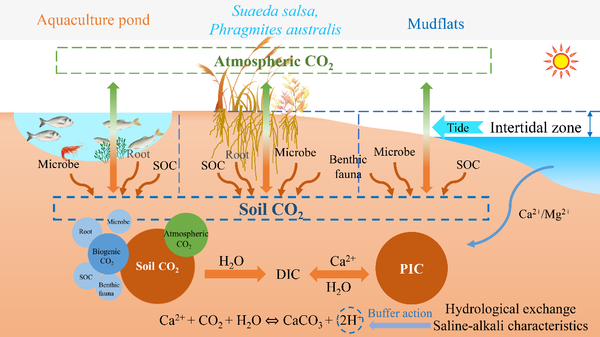 滨海湿地作为陆地和海洋之间物质交换的重要区域,其土壤无机碳的储量、来源及固定对大气CO2封存具有重要意义。该研究选取胶州湾光滩、养殖池塘、碱蓬和芦苇4种代表性湿地类型,采用稳定碳同位素技术测定土壤无机碳(SIC)、土壤有机碳(SOC)和土壤CO2的δ13C值,探究滨海湿地土壤无机碳的来源与固碳机理。结果表明,(1)不同形态土壤SIC含量存在显著差异。各湿地类型土壤SIC、溶解无机碳(DIC)、次生碳酸盐(PIC)含量范围分别为3.17 ~ 12.27 g∙kg-1、0.05 ~ 0.09 g∙kg-1、0.19 ~ 5.22 g∙kg-1;(2)在SIC组成及来源方面:PIC在SIC中占比高达59.7%~86.5%(养殖池塘除外),其形成过程中固定的CO2主要来自生物源,大气CO2起辅助作用,且滨海湿地植被恢复可促进生物源CO2的产生和PIC的形成;(3)在CO2封存的影响因素方面:高土壤pH和SOC有利于PIC形成过程中CO2的固定,而Ca2+和土壤含水量对大气源CO2的无机封存具有正效应,但对生物源CO2产生负效应;(4)滨海湿地PIC与SOC含量相当甚至高于SOC,且SOC向PIC的转化过程促进了短期地质碳循环向长期地质碳循环的转化。该研究初步揭示了滨海湿地土壤无机碳来源和CO2的封存机制,为深入理解滨海湿地碳循环过程,准确评估滨海湿地“蓝碳”生境的碳收支提供了科学依据。