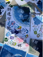 负责区域为11号场地,即“新”字前两笔,主色调为蓝色。同学们选取“海洋”题材发挥创作,勾描线稿、调色、填色、细化细节……生动的鲸鱼、可爱的宇航员、瑰丽的蓝色地球在同学们笔下栩栩如生,无不表达出环境学子们对海洋环境的重视与关怀和对保护生态环境、爱护人与动物共同家园的呼吁。完成绘画后,同学们纷纷在画纸上留下了自己的彩色手印,并写下“环境学院越来越好”的美好祝福,祝愿环境事业蒸蒸日上。