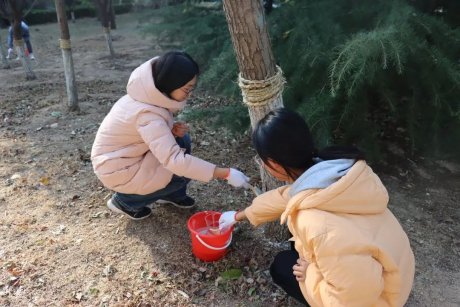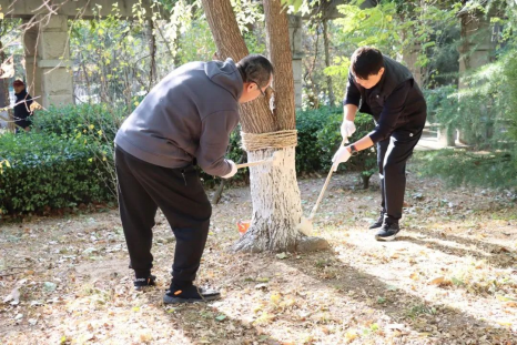 随着刘清亮宣布活动开始,在物业专业技术人员的指导下,各位党员同志和学生全心投入、热情参与,分工合作、干劲十足,展现出了良好的团队精神和责任意识,用实际行动践行生态环保理念,给百卉园的树木进行了“涂白”,穿上了“冬衣”,增强了树木抗寒防冻防虫能力,确保了树木健康生长,为美化校园做出了积极贡献。