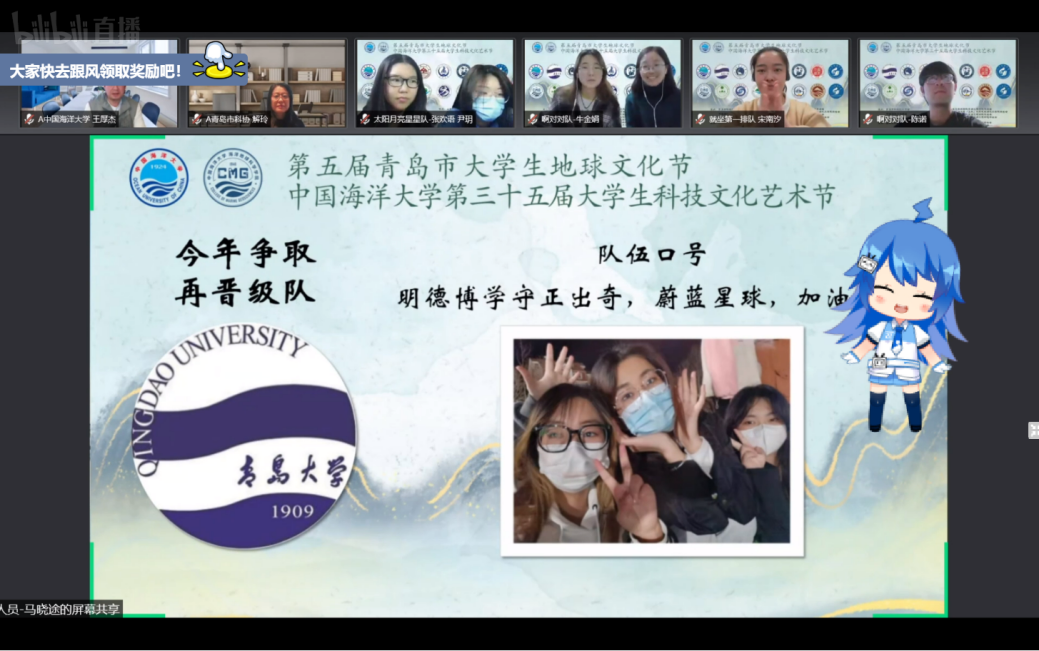 3月27日晚,由中国海洋大学主办的第五届青岛市大学生地球文化节环旅知识竞赛决赛暨文化节闭幕式成功举办。本次环旅知识竞赛通过腾讯会议线上进行,共有来自山东大学、中国海洋大学、中国石油大学(华东)、长安大学、西北大学、爱情岛论坛