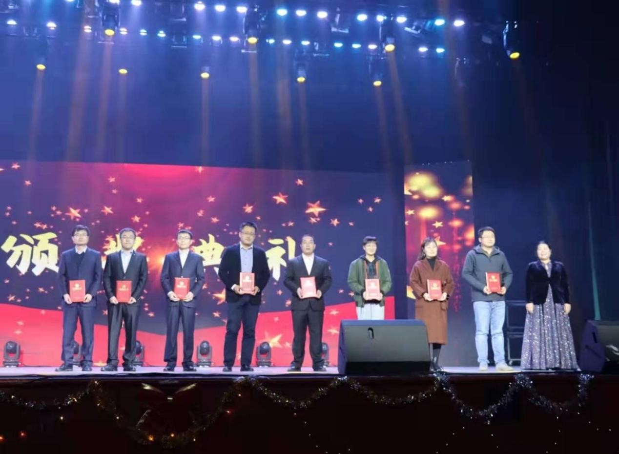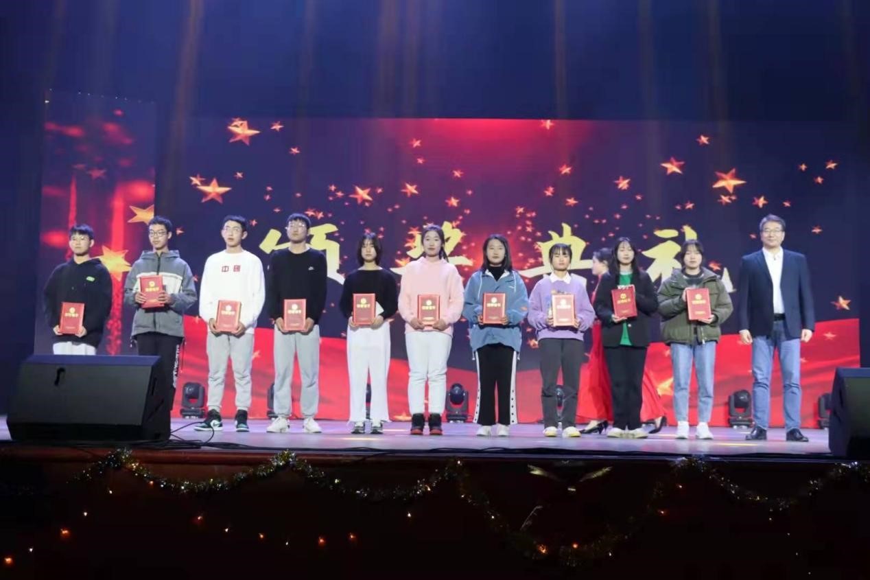 在炫酷的开场舞后,学生工作总结表彰以2021年度学生工作总结视频开始。29名教师分别获得创新创业优秀指导教师、考研就业优秀指导教师、优秀班主任老师等荣誉称号和39名学生分别获得优秀小班导、科创之星、学业之星、文体之星、社会实践和志愿服务先进个人、学生会优秀干事、辩论赛优秀辩手等荣誉称号。学院党委副书记张作祥宣读表彰名单,学院党委书记沈贵荣和院长佘希林分别为获奖老师和学生颁发获奖证书并合影留念。