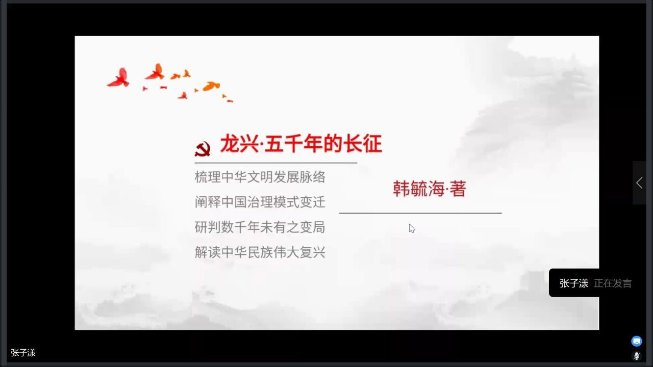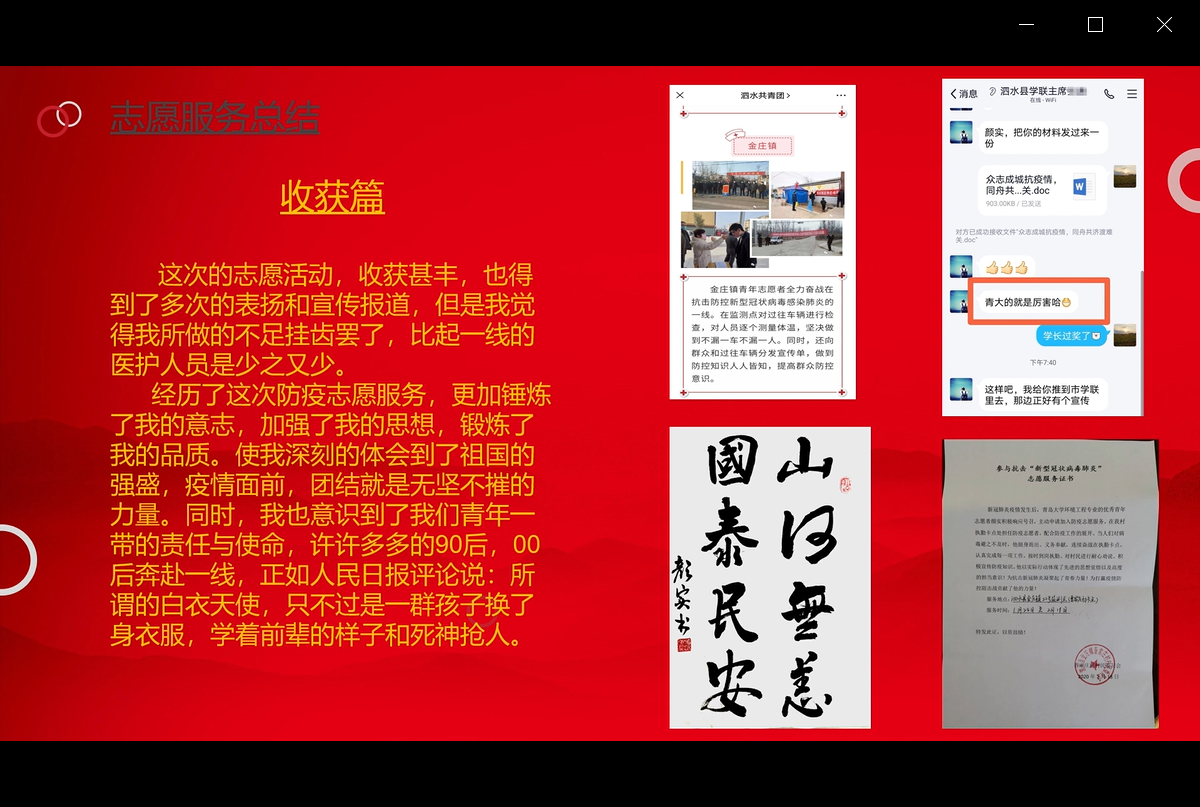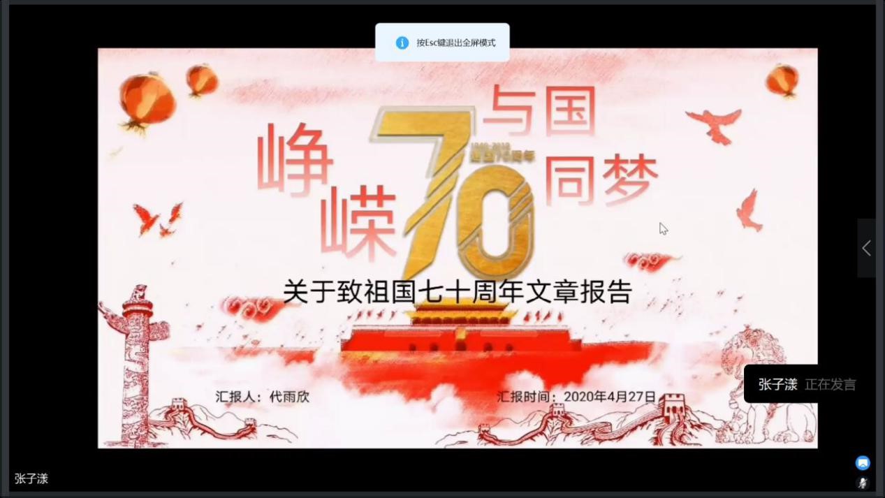 寒假期间,同学们按照放假前的活动安排和要求,积极参与“五个一”素质提升活动。其中“读一本人文社科类的好书”参与17人次,递交读书报告17份;“写一篇学习领会时政的体会文章”参与18人次,递交心得体会文章18份;“写一篇庆祝新中国成立70周年的文章”参与45人次,递交歌颂祖国文章45篇。其余两项同学们仍然克服新冠肺炎疫情带来的冲击和影响,仍然有4篇优秀的民生调研报告和2篇志愿服务记录上交。线上会议中,同学们以PPT的形式向大家分别展示了自己的作品、分享了活动心得,评委团现场打分评出20名同学分别获得一、二、三等奖和优秀奖项,并对获奖同学予以表彰奖励。