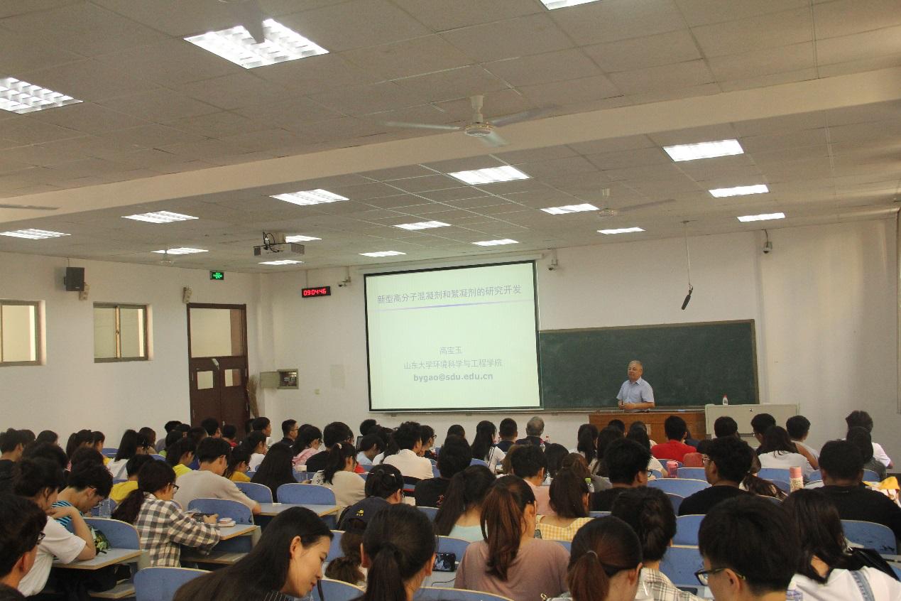 高宝玉教授首先对混凝技术及絮凝剂进行概述,他指出当前絮凝剂的使用已从传统金属盐凝聚剂进入高分子絮凝剂时代,并趋于向多功能高分子絮凝剂和生物絮凝剂方向发展。然后,对其研究团队在纳米聚合铝絮凝剂、新型高效有机高分子絮凝剂、新型无机复合高分子絮凝剂、钛盐混凝剂等研究领域开展的主要工作进行了介绍。最后,对该领域未来的研究方向提出了建议。报告结束后,高宝玉教授与在场师生进行了互动交流,并对提出的问题进行了细致耐心地解答。