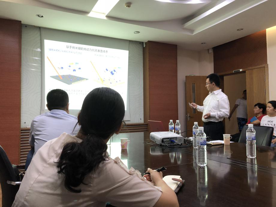 吴教授首先简单介绍了天津大学新校区的一些基本情况,然后对细菌与人类之间的关系的阐述,向我们揭示了研究光控抗菌技术的重要性。相比于目前常用的抗生素、金属纳米粒子杀菌剂和有机抗菌剂,光控抗菌技术可以通过活性氧(ROS)、光热的协同效应,原位杀死致病菌,副作用小,有效避免细菌产生耐药性以及对组织造成损伤等后果。他重点介绍了课题组最近研究开发的一系列光敏表面系统,如氧化石墨烯/Ag/胶原蛋白、单宁酸/Fe3+/Ag、黑磷纳米片(BPSs)/聚(4-吡啶酮甲基苯乙烯)内过氧化物(PPMS-EPO)、壳聚糖/MoS2、Ag@AgCl等,其中具有不同波长的光可以激发涂层的光催化或/和光热性质,以通过光照射期间的电子跃迁或振荡产生大量的自由基氧物质(ROS)或高温。ROS和/或高温可以通过破坏细菌膜和内部质量(例如蛋白质和DNA)直接杀死细菌,从而赋予涂层高度光动力学和光热抗菌能力。有时,细菌感染的光热和光动力疗法可以相互结合或采用其他技术,从而对抗菌疗法和组织修复或重建具有理想的协同效应。报告过程中,师生们仔细聆听,认真笔记,踊跃提问,吴教授耐心回答,现场学术氛围浓厚。