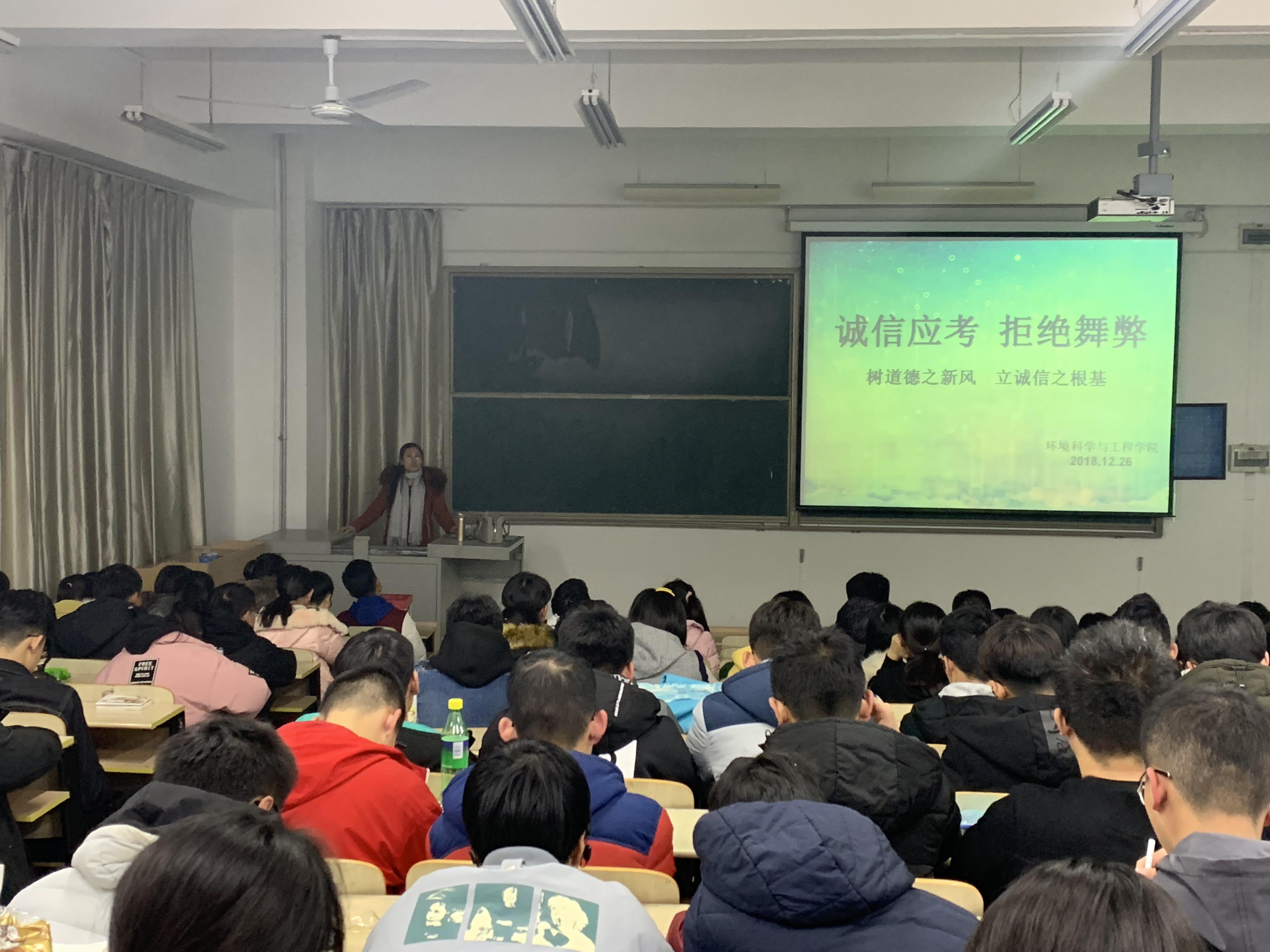 为营造良好的学风,严肃考风考纪,12月26日和27日,环境科学与工程学院辅导员王会萃老师分别为2018级全体新生和2016级全体本科生召开了两次“守考风 遵考纪”动员大会。