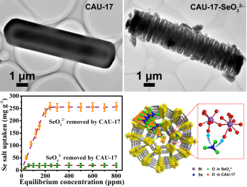 硒是人体和动植物所必需的微量元素之一,然而硒的摄入量稍微过高,就会产生与砷类似的毒理特性,对生物体造成极大的危害。因此,世界卫生组织和欧盟把饮用水中硒浓度上线设为10 ug/L。在多数情况下,硒是以硒酸根离子(SeO42-)和亚硒酸根离子(SeO32-)的形式存在于水体中,其中四价硒(SeO32-)的毒性要大于六价硒(SeO42-)。因此,对SeO32-的去除显得至关重要。硒的的同位素79Se 是235U 长期裂解过程中的重要产物,其半衰期长达3.77×105 年,具有一定的放射性危害,是核废水中常见的放射性污染物。杨东江教授团队在前期研究的基础上(Adv. Mater. 2008, 20, 2777; Water Res., 2010 , 44, 741; Angew. Chem. Int. Ed. 2011, 50, 10594;Nanoscale, 2013, 5, 2232;Nanoscale, 2013, 5, 11011),首次利用铋基有机金属框架材料(Bi-CAU-17)实现了对污水中SeO32−的选择性高效捕获。这种材料对SeO32−饱和吸附量高达255.3 mg/g,且吸附速度非常快,1 min内即可达到吸附容量的80%以上。在宽的pH值范围内(4-11)都能够稳定并且高效地吸附SeO32−,且在2000倍共存离子条件下,表现出较强的选择性吸附性能,真正实现了对SeO32−高效高选择性富集。本研究对水体中高毒性污染物的选择性捕获具有非常重要的意义。