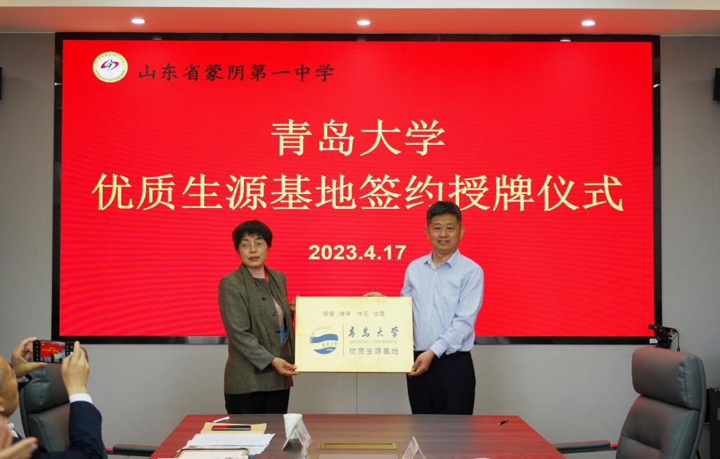 在蒙阴第一中学,双方举行优秀生源基地签约和授牌仪式,并重点围绕本科生招生和产学研合作等方面进行深入交流。蒙阴县人大常委会党组成员、副主任王锦栋、临沂市生态环境局蒙阴县分局副局长刘继奎和蒙阴一中副校长戚建芬、张茂贵等学校领导和年级主任参加活动。