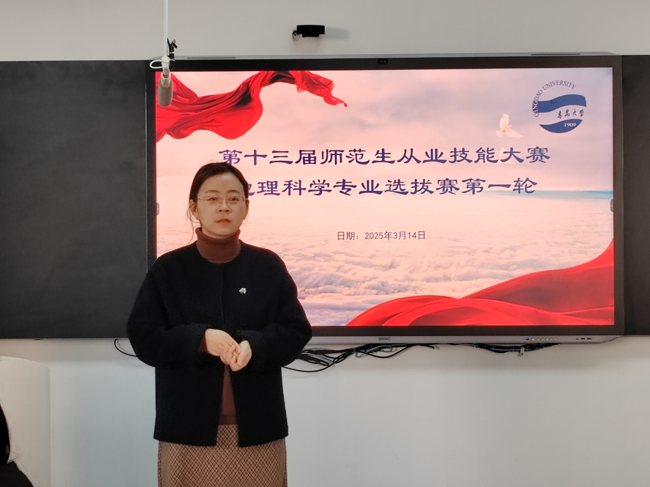 师范生教师职业技能,促进师范生教育教学能力与综合素质提升,进一步培养学生积极上进、挑战自我的优秀品质,学院于3月14日上午举办第十三届山东省师范生从业技能大赛地理科学专业第一轮选拔赛。本次比赛共有18位地理科学专业(师范)本科生选手参赛,王树德老师、徐雪老师及六位学科教学地理专业的研究生担任评委。比赛由徐雪老师主持。