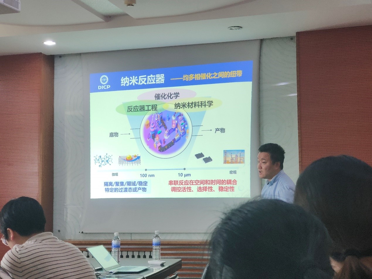 刘健研究员首先介绍了纳米反应器的特点,并由自然界中的化学转化引出具有限域效应的微/纳米反应器,利用微/纳米反应器可以提高反应的效率和选择性,并可以在温和的条件下催化化学反应,所以设计合适的反应器并优化操作条件是化学工程中至关重要的步骤。他还介绍了课题组在微/纳米反应器领域的最新研究进展:1. 实现不同形貌和结构的纳米反应器定制;基于空间限域效应、隔离效应、协同效应等催化机制,将构筑的微/纳米反应器应用于催化理论基础研究;2. 认识微/纳空间中的催化反应过程,揭示纳米反应器中串联催化反应在空间和时间的耦合问题;3. 纳米反应器在金属-/硒等涉及催化反应电化学电池中的应用和重大疾病的早期诊断的应用研究。最后,指出了纳米反应器在应用中的局限性:材料宏观和微观尺度无法实现有效的衔接,尽管创造了多样的纳米制造技术,但微纳甚至更小尺度的科学问题亟需深入研究和发展。