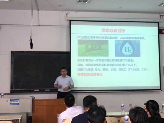 李朝升教授将课程思政元素融入专业报告,从国家战略目标、发展氢能源的意义、氢能源的应用场景及现在面临的问题等深入浅出介绍了太阳能分解(海)水制氢的研究现状。重点介绍了团队利用太阳能分解(海)水制氢的最新研究进展,包括构造图灵结构光阳极提升电荷分离效率、增加亚稳相光催化剂热稳定性和提高光电催化分解海水制氢活性策略、高效分解海水制氢的新型电催化剂的制备等。会上,他还耐心解答了师生提出的问题,现场学术氛围浓厚。