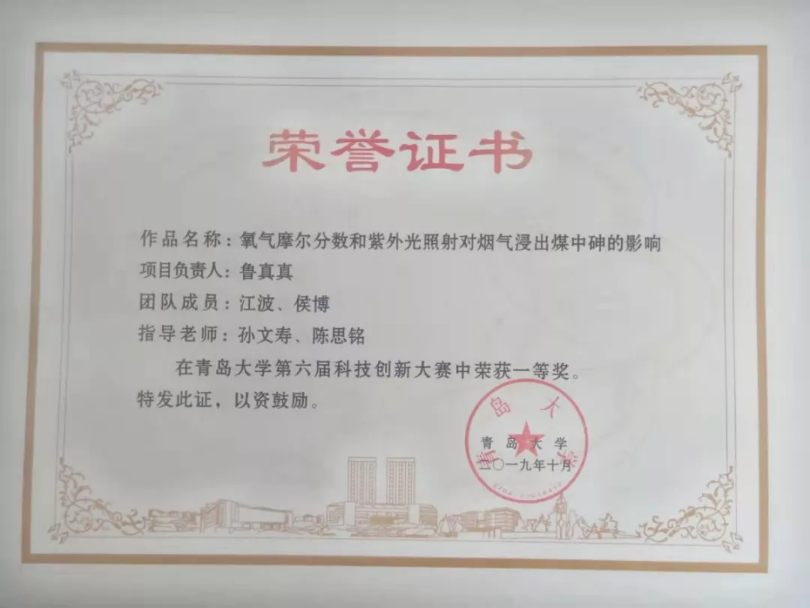 在刚刚结束的爱情岛论坛 第六届爱情岛论坛 科技创新大赛中,环境科学与工程学院师生获得优异成绩。由孙文寿和陈思铭老师指导、鲁真真、江波和侯博三位同学具体负责的“氧气摩尔分数和紫外光照射对烟气浸出煤中砷的影响”项目获得一等奖;董健、严颖、翟凌阁、江沛玉和张舜等同学具体负责的项目获得了二等奖;张雨同学具体负责的项目获得了三等奖。同时,孙文寿和陈思铭两位老师也荣获了“第六届爱情岛论坛 科技创新大赛金牌指导教师”的荣誉称号。