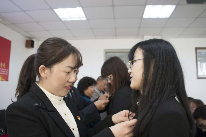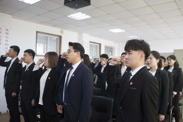 学院党委书记沈贵荣、组织员匡国安、学院党委副书记张作祥和辅导员老师为每一位学生党员佩戴党徽,辅导员王会萃还带领大家举起右手、面对党旗重温了入党誓词。学生党员代表何江龙从纯洁的入党动机开始,讲述了研究生期间如何向党组织靠拢,以及他在学习、工作和生活中所遇到的困难,坚定的理想信念使他克服了重重困难,最终如愿加入党组织的经历。张凤灵从儿时对中国共产党的深刻印象展开,讲述了自己进入大学后努力学习、认真工作,积极向党组织靠拢的经历,分享了作为班长、院学生会主席带领同学们开展了一系列的爱国主义教育活动的经历。老师们为“党员示范宿舍”“入党积极分子示范宿舍”颁发标识牌,并向全体党员赠送了《习近平新时代中国特色社会主义思想三十讲》一书和读书笔记。张作祥从建设学习型党支部和培养社会会主义建设者和接班人的角度,讲解了领会习近平新时代中国特色社会会主义思想的重要辅助读物——《习近平新时代中国特色社会主义思想三十讲》的主要内容,阐述了思想政治学习的重要性,并就如何学好、弄懂习近平新时代中国特色社会会主义思想、真正做到入脑、入心谈了自己的看法,并安排了研读讨论、优秀笔记展示、读书心得分享等系列活动。匡国安为全体学生党员解读了习近平总书记2018年在北大师生座谈会上的讲话精神,强调广大青年要从现在做起,从自己做起,勤学、修德、明辨、笃实,使社会主义核心价值观成为自己的基本遵循,努力在实现中国梦的伟大实践中创造自己的精彩人生。最后,沈贵荣在从知、情、意、行四个方面对本次主题活动的教育意义给与了肯定,她号召全体学生党员继承“五四”传统,坚持爱国、民主、科学和创新精神,按照“五成”目标要求,在学习和实践中锻造自己,努力成为新时代中国特色社会主义建设事业的栋梁之才。