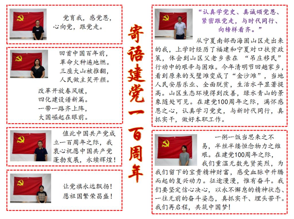 2021年是中国共产党建党100周年,百年风雨,历经沧桑,在中国共产党的带领下,祖国繁荣昌盛,人民幸福安康。在这个具有历史意义的日子,环境材料系党支部开展寄语建党100周年活动,请听听全体党员的心声!