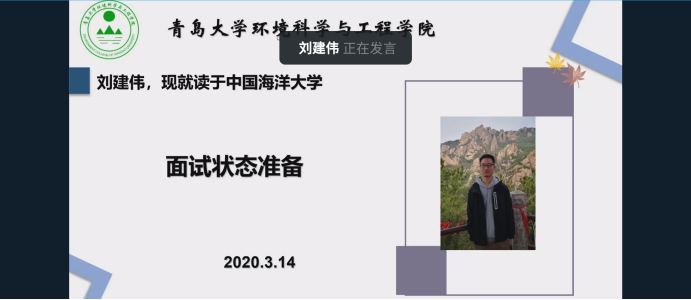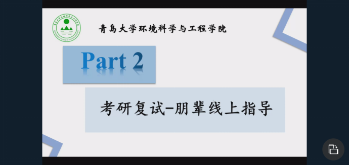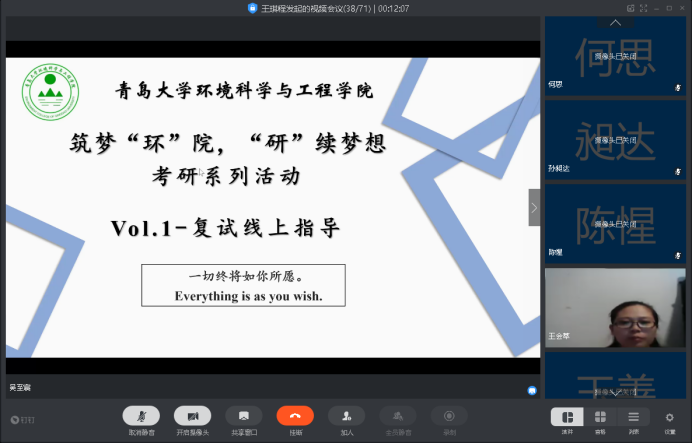 为进一步提高考研录取率,环境科学与工程学院自3月8日晚开始,通过钉钉视频会议连续举办了三场2020“筑梦环院,‘研’续梦想”考研复试线上指导—朋辈经验分享会,学院2019年考取硕士研究生的6名学生分别与2020年报考研究生的同学们进行线上交流。