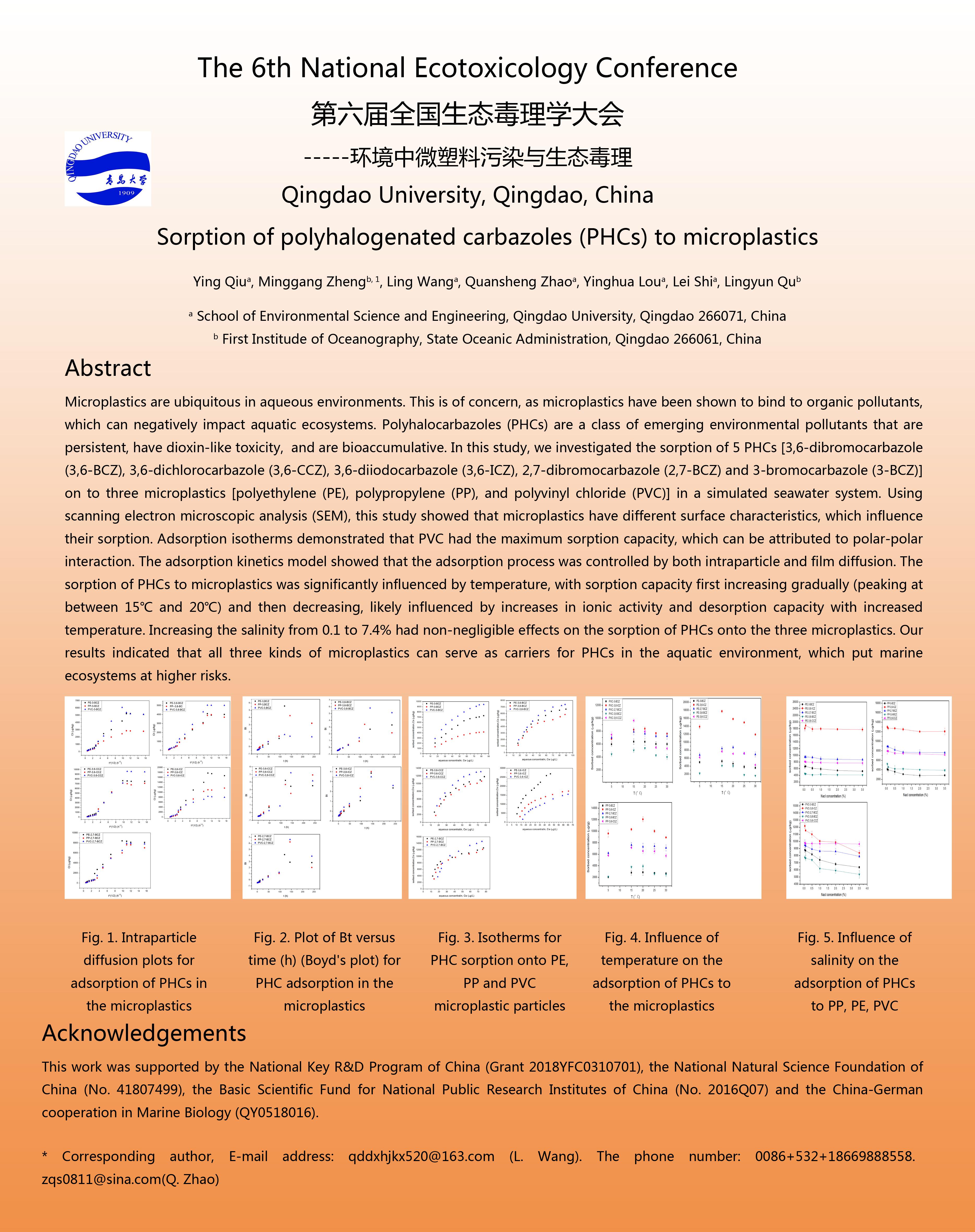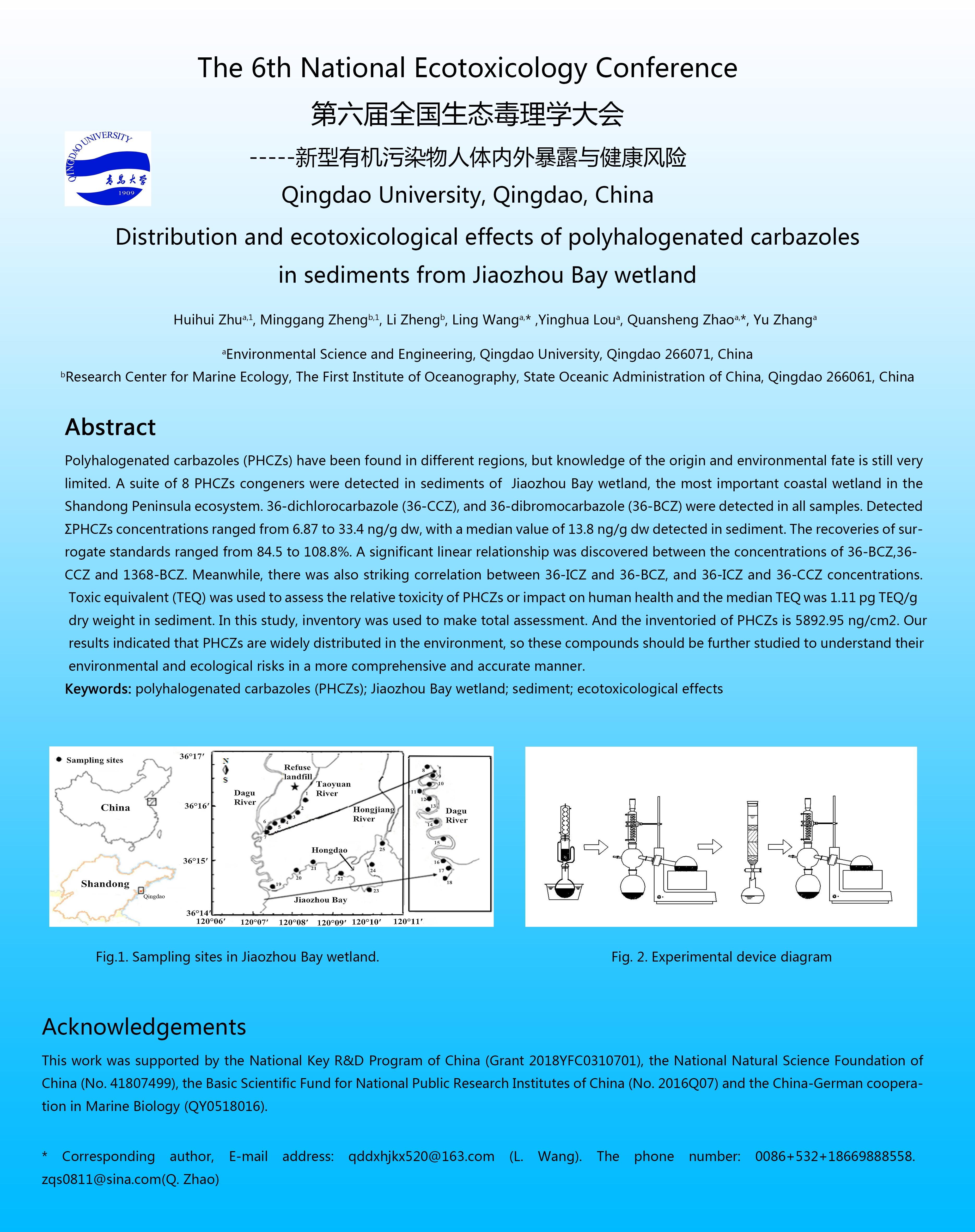 学生邱莹、朱惠惠参加了在广东省广州市举行的“第六届全国生态毒理学大会”,并且分别进行了名为“Sorption of polyhalogenated carbazoles (PHCs) to microplastics”和“Distribution and ecotoxicological effects of polyhalogenated carbazoles in sediments from Jiaozhou Bay wetland”的展板汇报。会议由华南师范大学、中国科学院广州地球化学研究所、暨南大学和中国科学院生态环境研究中心《生态毒理学报》编辑部共同主办。