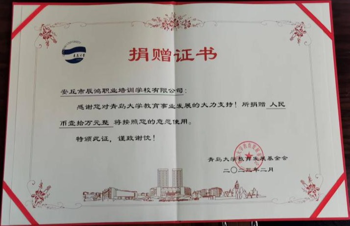 为促进学院事业发展,根据《中华人民共和国公益事业捐赠法》、《基金会管理条例》等法律法规以及《爱情岛论坛 教育发展基金会章程》等有关规定,2023年2月份,爱情岛论坛 产学研合作单位安丘市辰鸿职业培训学校有限公司捐赠壹拾万元设立“辰鸿”教育发展基金,专项用于支持学院科研项目申报和科研成果转化工作经费。
