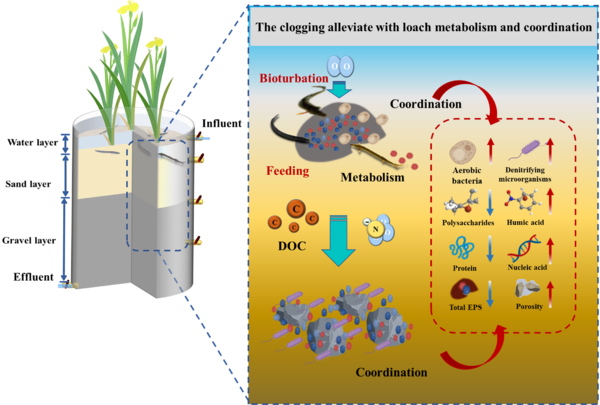 微生物过量分泌的胞外聚合物质(EPS)会导致人工湿地堵塞,这是人工湿地长期稳定运行面临的主要挑战。该研究深入探究了泥鳅(Misgurnus anguillicaudatus)缓解人工湿地堵塞的水力评价和代谢过程。研究结果表明:(1)泥鳅降低了基质层堵塞物的含量,提高了系统的水力性能。泥鳅系统使沙石层初始孔隙度分别提高了11.52%、25.11%和28.15%,砾石层初始孔隙度分别提高了15.49%、15.85%和13.83%。此外,泥鳅还增加了实际和理论水力停留时间(HRT),加强了不同层之间的连通性,减少了系统的“死区”面积。(2)EPS组分分析结果表明,每条泥鳅每天的EPS去除量为36.64 mg·L-1,其中S-EPS、LB-EPS和TB-EPS去除量分别为21.80、8.02和6.82 mg·L-1。泥鳅通过直接进食以及与微生物之间的间接配合有效降低了EPS中多糖和蛋白质的含量,提高了腐植酸和核酸的比例。堵塞物的特性分析进一步证实,泥鳅降低了酪氨酸和色氨酸的荧光基团含量及EPS大分子中蛋白质或多肽物质的比例。(3)泥鳅提高了沙石层中脱氢酶、乙酸酯氧化酶的活性及绿菌科(Chlorobiaceae)的相对丰度,从而促进了微生物代谢和堵塞物的水解。同时,泥鳅还增加了砾石层中气单胞菌科(Aeromonadaceae)、红环菌科(Rhodocyclaceae)和嗜氢菌科(Hydrogenophilaceae)等反硝化微生物的相对丰度,增强了系统的反硝化过程,有利于污染物转化和堵塞物质降解。综上所述,该研究系统的评估了泥鳅在缓解人工湿地堵塞中的生态友好策略,为改善人工湿地的长期稳定运行提供了新的思路和方法。