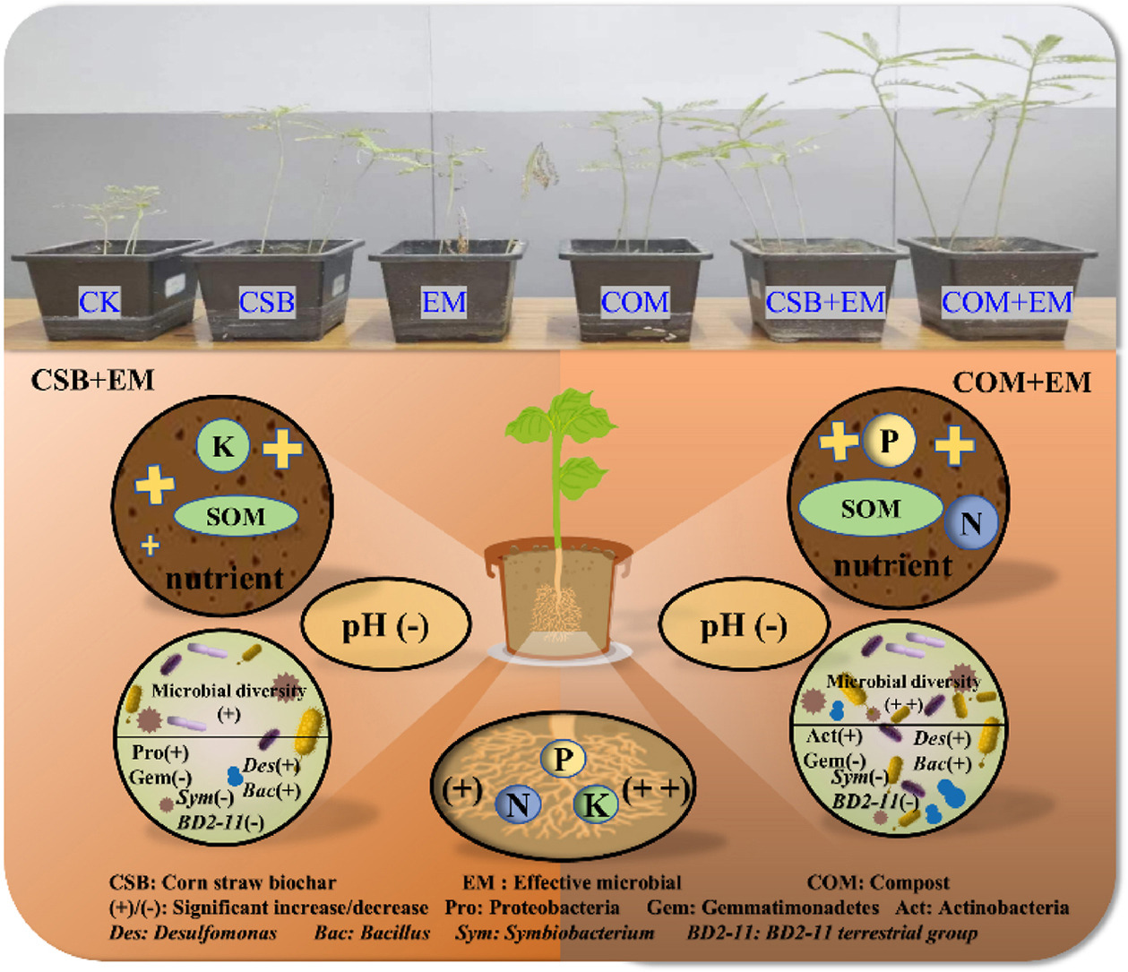 改善退化海岸盐碱土的质量和促进植物生长是恢复沿海地区生态功能的关键挑战。有机改良剂如EM菌剂、生物炭和有机堆肥,已被提出作为可持续的解决方案。该研究通过盆栽实验系统评估了五种有机改良策略对田菁生长的影响,包括单独施用EM、玉米秸秆生物炭(CSB)和污水污泥-芦苇秸秆堆肥(COM),以及CSB+EM和COM+EM的联合处理。研究发现:(1)与单一改良剂处理相比,联合策略(CSB+EM和COM+EM)显著促进了田菁的生长,植物干重达到对照组的4.61‒12.1倍;(2)联合改良策略通过改变土壤特性有效促进了植物生长和营养吸收。其中,COM+EM处理效果尤为显著,使土壤pH值降低2.79%‒3.49%,同时显著提升了土壤养分含量、溶解有机物的数量和质量、微生物群落多样性以及植物生长促进根际细菌(PGPR)的丰度(如芽孢杆菌属);(3)斯皮尔曼相关系数和结构方程模型证实,这些土壤改良措施直接促进了植物养分的吸收。综上,COM+EM和CSB+EM的联合策略,特别是COM+EM处理,对沿海盐碱土壤改良具有显著效果,为改善退化沿海生态系统的土壤肥力和植物生产力提供了有效的解决方案。