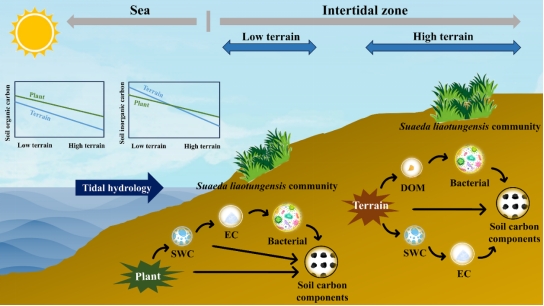 滨海盐沼是沿海“蓝碳”生态系统的重要组成部分,表现出高的碳固存能力,对减缓全球气候变化、保护生物多样性有重要意义。地势和植物在影响盐沼土壤中水、盐、碳和微生物群落的变化方面起着至关重要的作用。本研究测定了胶州湾滨海盐沼不同地势下根际和非根际土壤的各种理化性质,此外还对土壤碳组分含量、溶解性有机质(DOM)和微生物群落的成分进行了分析。研究结果表明,植物可以调节土壤理化性质和碳组分含量,导致不同地势下根际土壤的SOC含量无显著差异。高地势土壤具有较高的微生物多样性和活性,植物通过根际效应显著影响土壤中的微生物群落结构。结构方程模型表明,地势通过影响土壤DOM组分和微生物多样性对SOC产生间接作用,并通过改变土壤含水量(SWC)、电导率和DOC对SIC产生间接影响。而植物也直接或间接影响SOC含量,并通过改变SWC间接影响SIC含量。该项研究可为全面理解滨海盐沼碳固存和揭示滨海盐沼碳汇的潜在机制提供理论支撑。
