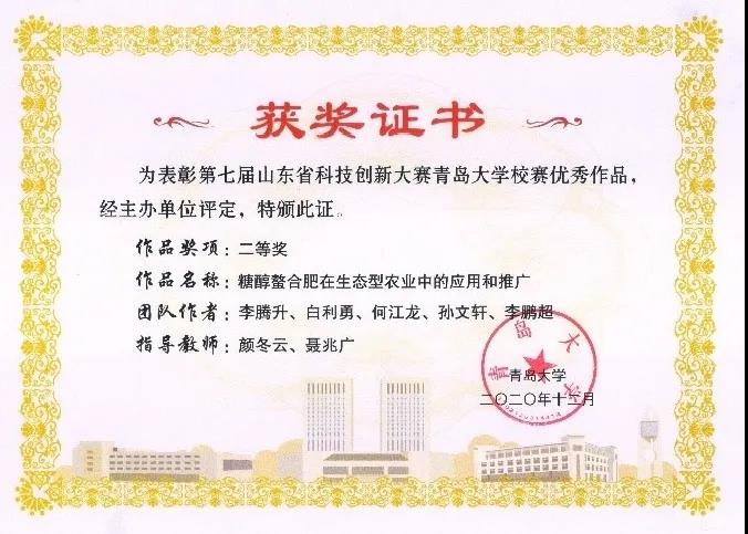 此次竞赛全校共800多个项目,其中有20个项目被推荐进入省赛,得知自己的项目也从中脱颖而出的时候,他的内心非常开心和激动,激动之余,又根据校赛专家的意见对申报书和PPT进行了相应的修改,精心准备省赛,最终荣获第七届山东省科技创新大赛省级三等奖。